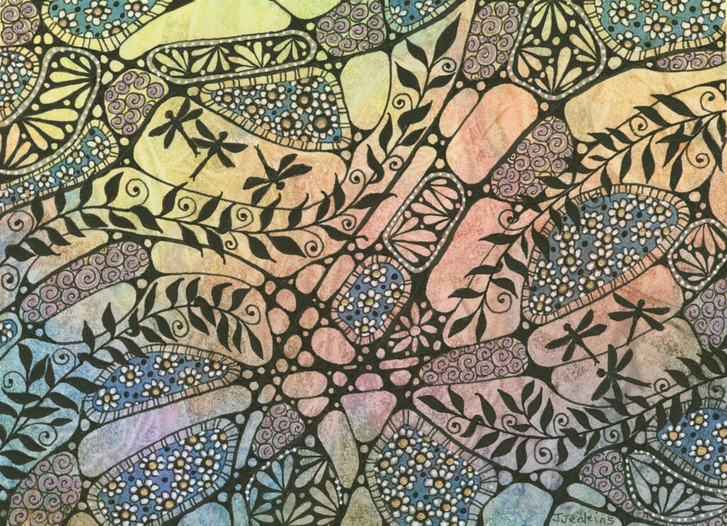 Raised for the most part in Quebec, Jan Jenkins worked in Alberta’s energy industry until she moved to Manitoba where she now creates original art for smaller spaces and wearable art for that unique look. Her work is influenced by the meditative art form of zendoodling along with intricate repeating patterns found in textiles, decorative tiling and nature. Most memorable for Jan are having two of her designs selected by the town of Russell, MB to adorn their decorative main street steel arches, having her In The Wind artworks included in Manitoba Art Network’s touring exhibition program, and participating in a Manitoba Arts Network digital collaboration videography project with musician Raine Hamilton. She is a member of the Manitoba Society of Artists, The Drawn Together Collective, the Art Gallery of Soutwestern Manitoba, Wasagaming Community Arts and Arts West Council. For more information about Jan and her art please visit www.janjenkins.art